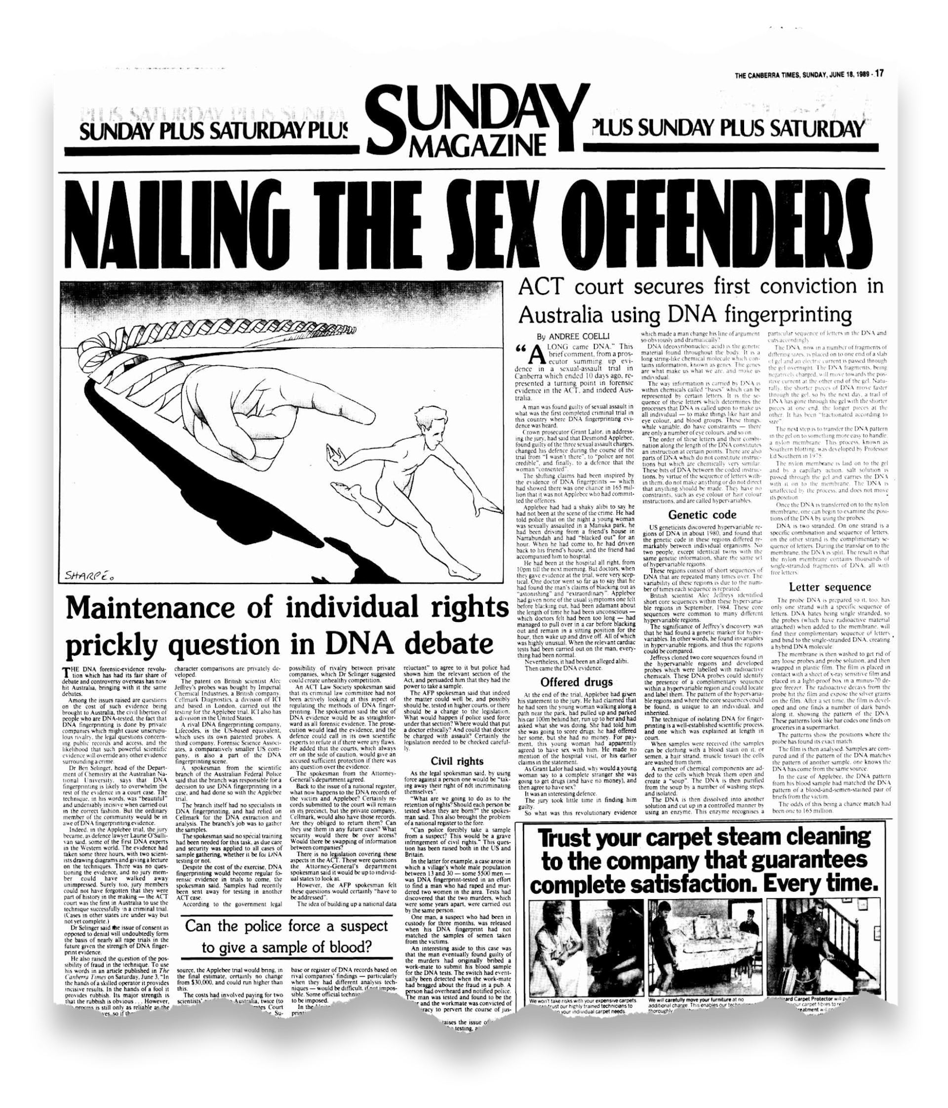 Forensic DNA testing was not done in Australia at the time. But Australian Federal Police officers had heard about the Pitchfork case. They had samples from the Applebee investigation hand-couriered to Cellmark Diagnostics in the UK, the company licensed by Jeffreys to use his DNA technique.