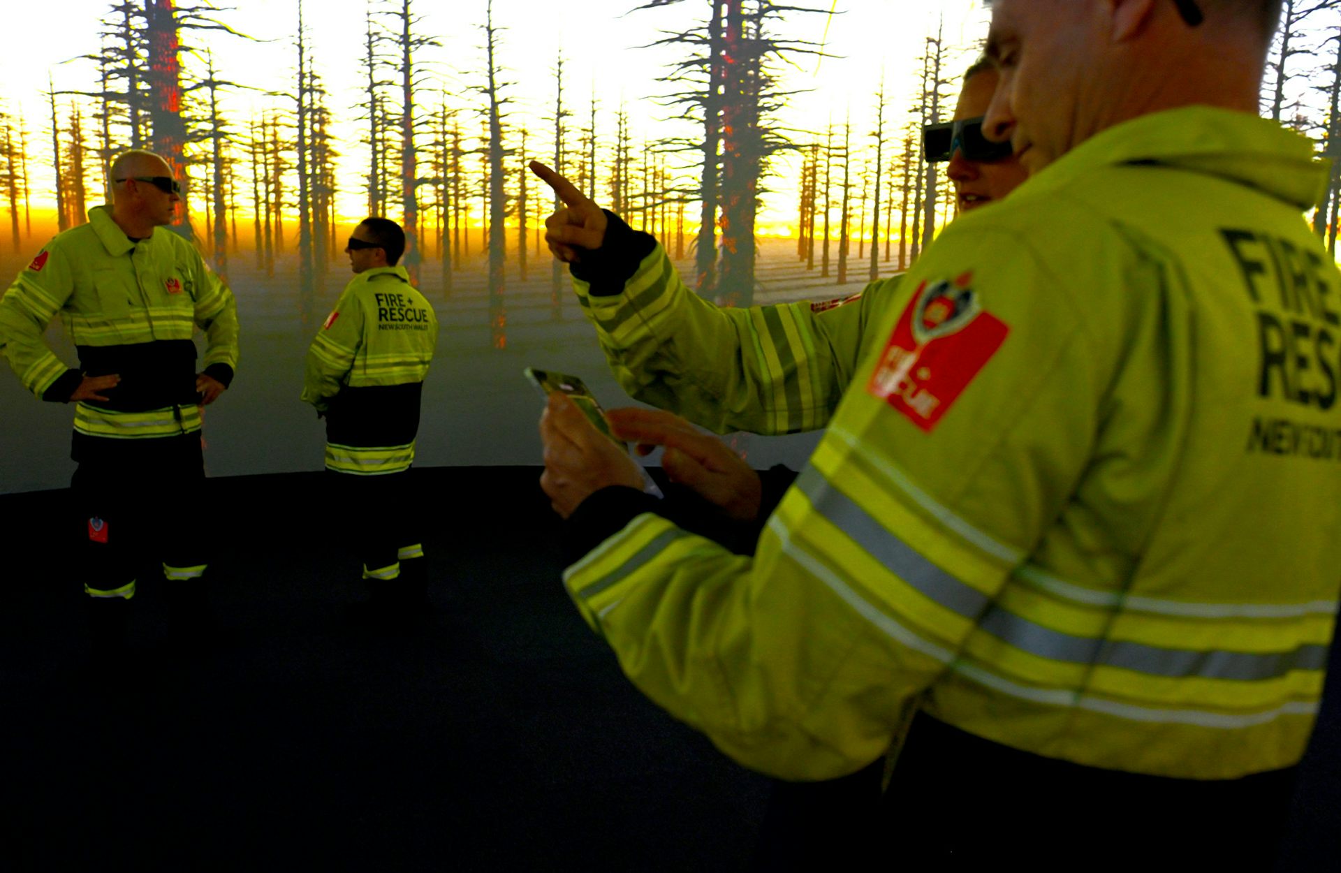 The system puts fire crews in the centre of these simulated firegrounds using immersive cinematic scenarios. The crews feel as though they are physically present. They can experience the fire from any point of view – aerial or on the ground – at any point in time, and interactively engage with it.