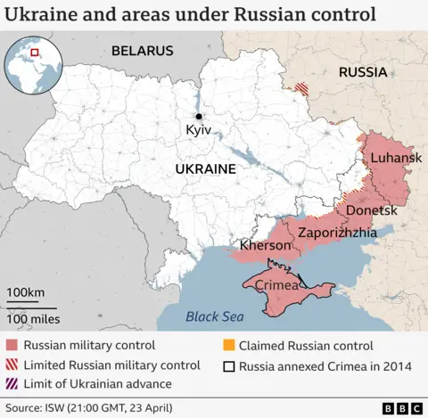 Russia’s occupation of almost 20% of Ukraine would be de facto recognised behind existing front lines, in effect freezing the conflict in four Ukrainian regions: Donetsk, Luhansk, Kherson and Zaporizhzhia.
