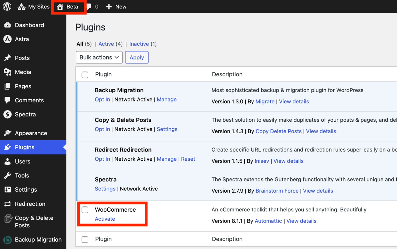 7. The second store in our network — Beta — is located in California, USA, and will be used to sell cosmetics. For this, we will first have to activate WooCommerce on Beta.