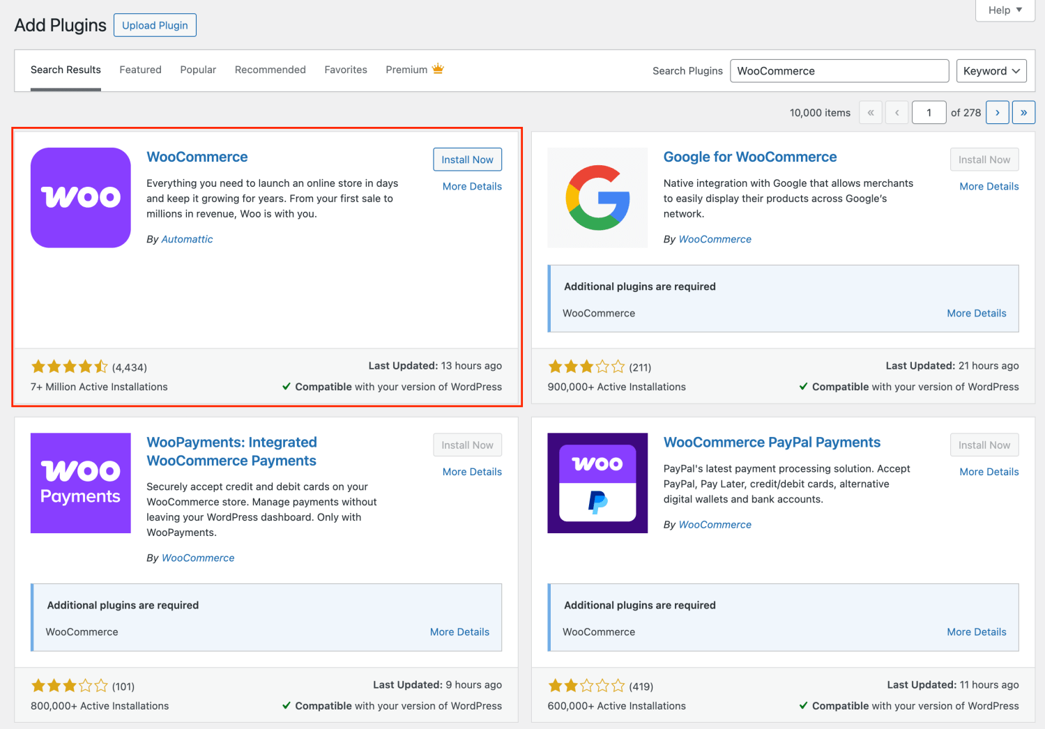 - Install and activate WooCommerce. This will install WooCommerce on all individual sites of your network, but you will need to activate it independently on the sites where you need it.