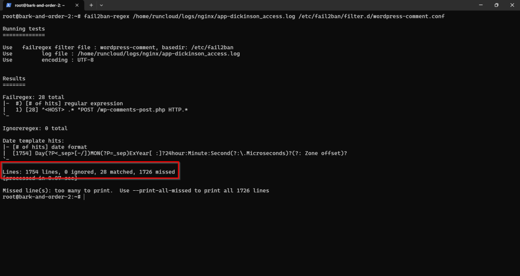 sudo fail2ban-regex /home/runcloud/logs/nginx/your-app-name_access.log /etc/fail2ban/filter.d/wordpress-comment.conf