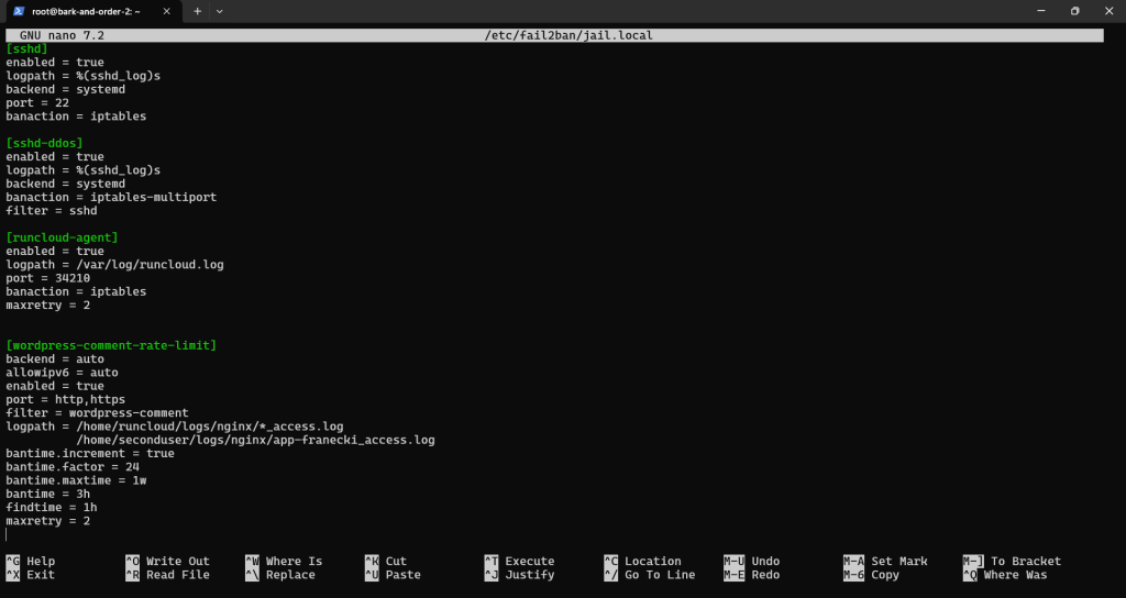 Now, we define a “jail” that uses the filter we created and specifies the conditions for banning (like maxretry, findtime) and the ban duration (bantime). It’s important to add this configuration to jail.local to avoid it being overwritten by package updates.