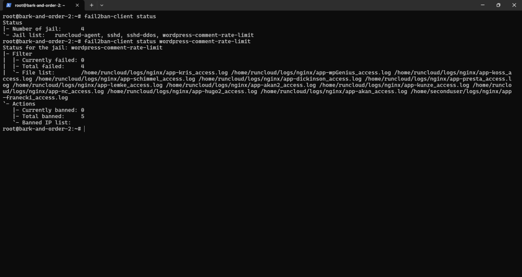 sudo fail2ban-client status wordpress-comment-rate-limit