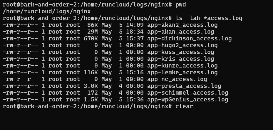 On servers managed by RunCloud, Nginx stores separate access logs for each web application you’ve created within the /home/<username>/logs/nginx/ directory, named following a pattern like your-app-name_access.log.