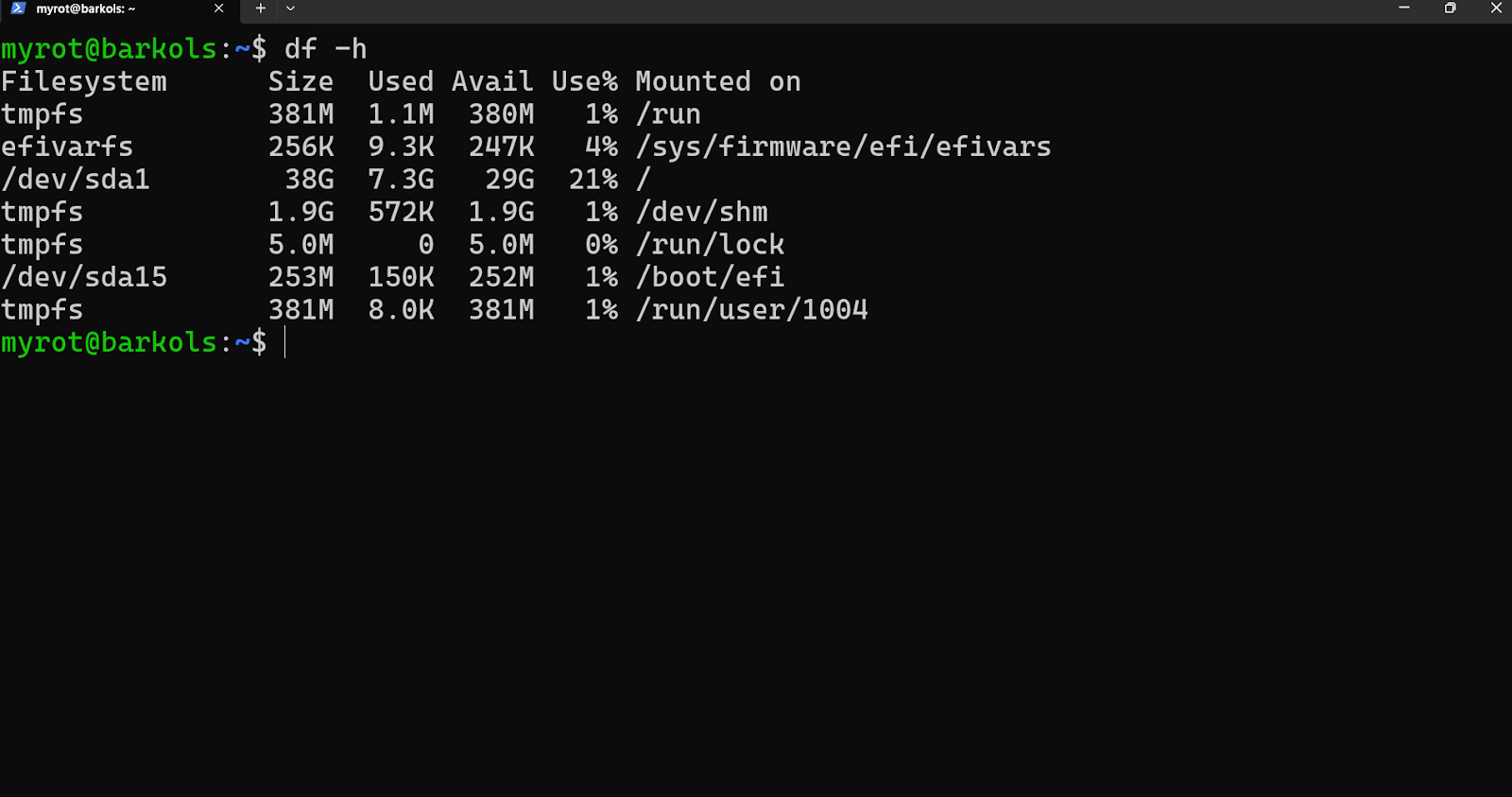 While you can simply type df, the output shows space in 1-kilobyte blocks, which isn’t very easy to read. We’ll use the -h (human-readable) flag for a much clearer view. To use this tool, open your terminal and run the following command: