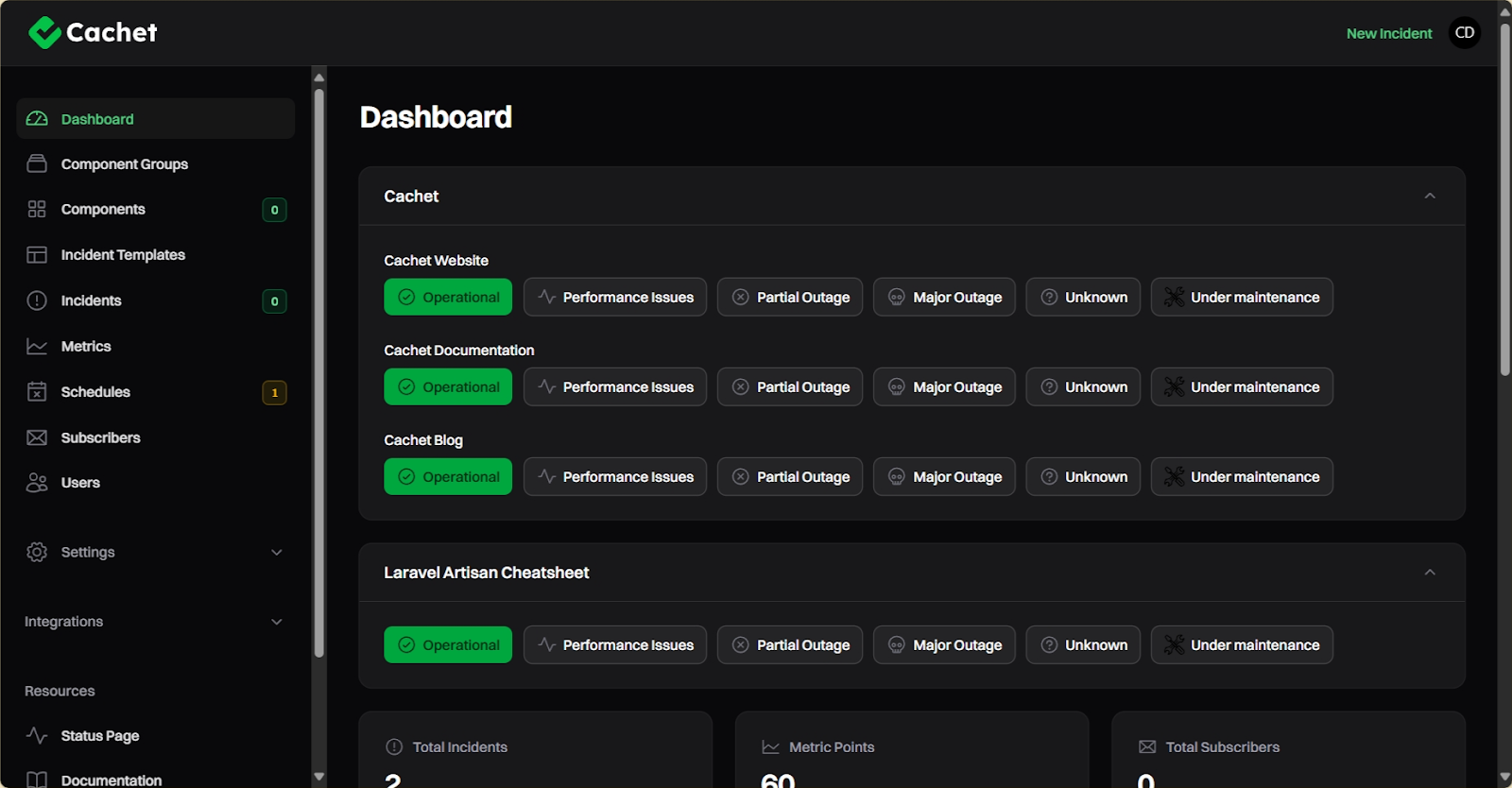 Cachet is a feature-rich, open-source status page system built with Laravel. Here’s a quick rundown of its powerful features: