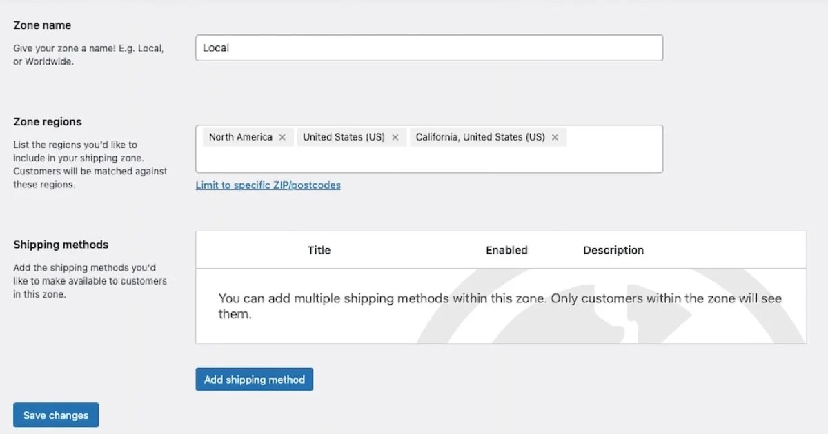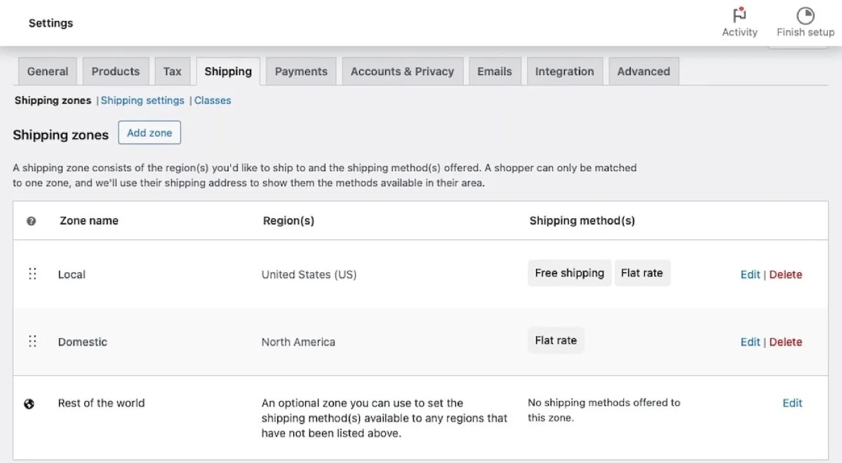 In the above example, zones have been configured for local deliveries and domestic shipping. For the Local zone, Free shipping and Flat rate shipping have been set as the shipping methods.