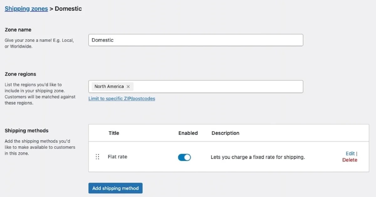 When you’re done, go back to Shipping zones and define shipping costs for each class you’ve created. In this example, the Domestic shipping zone has Flat rate shipping set as the method. Click Edit next to the method to access more settings.