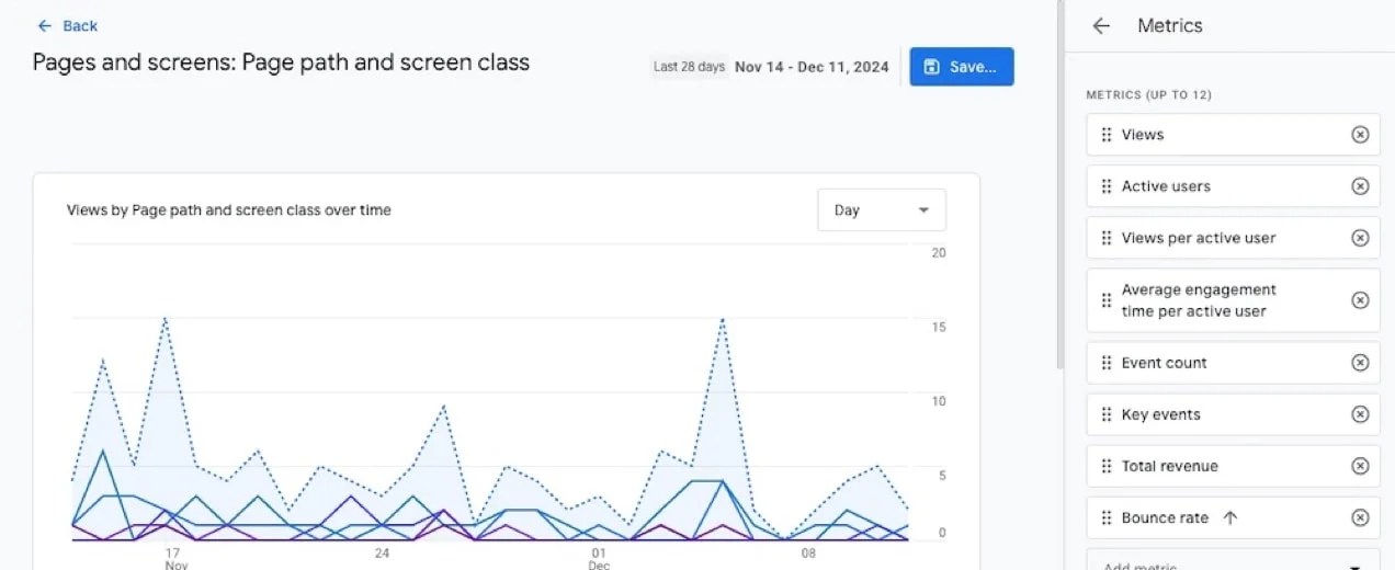 - In the customization panel, click Metrics then Add metric. Search for and select Bounce rate.