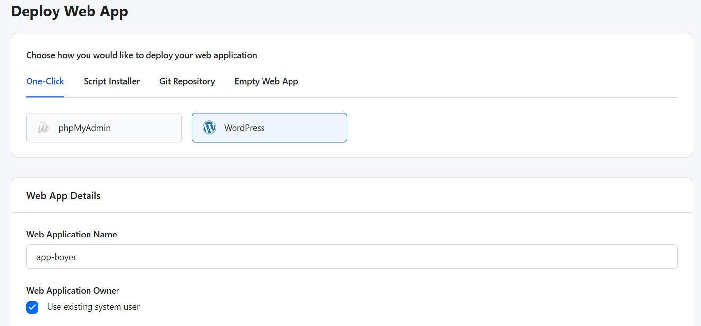 On the next screen, use RunCloud’s “Script Installer” within the Web Application settings to install a fresh, clean copy of WordPress on this new space.