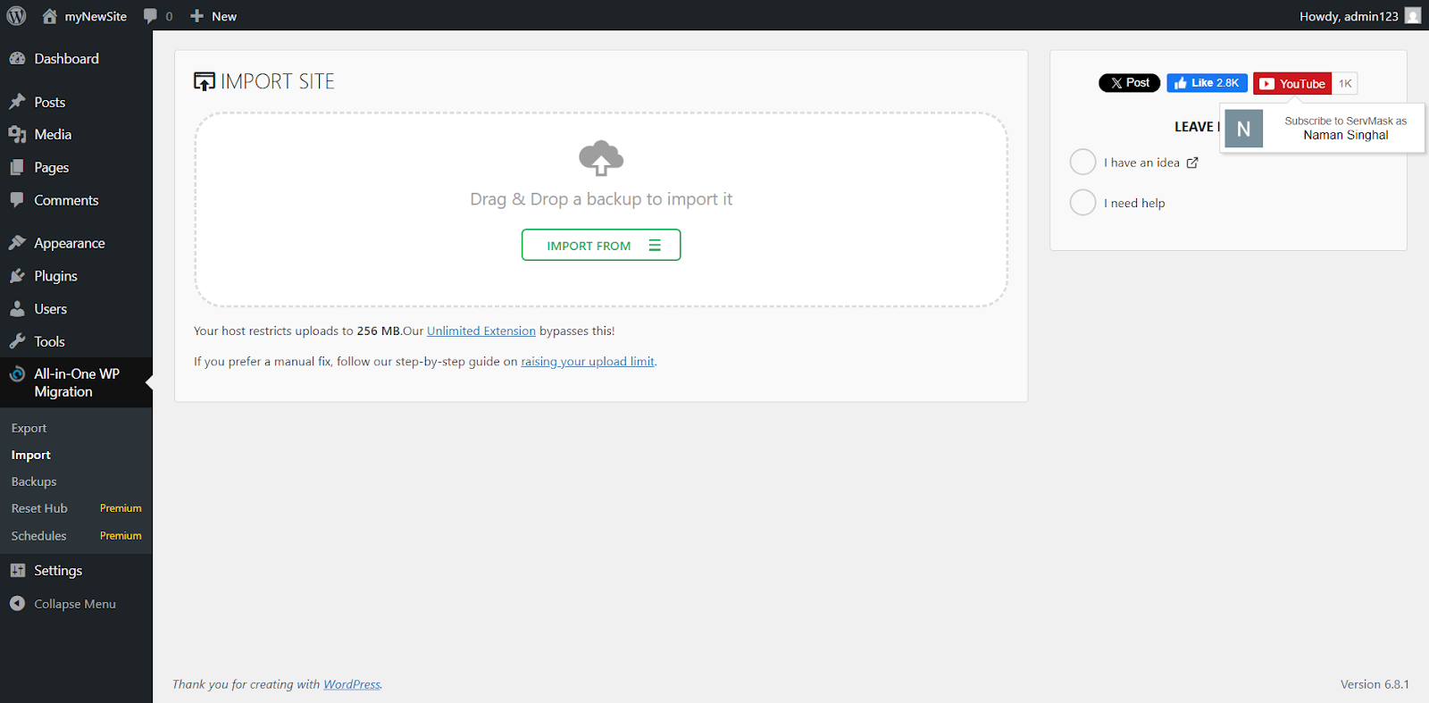 In this section, we’ll guide you through using the popular “All-in-One WP Migration” plugin, known for its ease of use. However, this plugin has file size restrictions in its free version, potentially requiring a paid extension for larger websites.