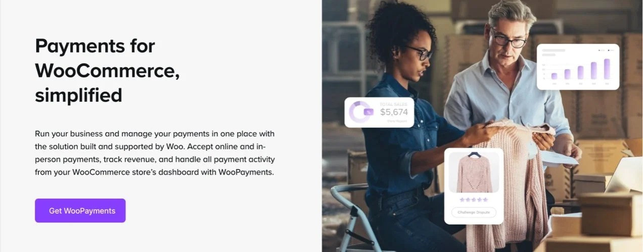 Woo Payments page with a photo of store owners working and the text "Payments for WooCommerce, simplified"