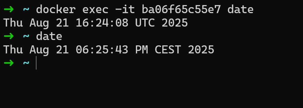 In the above example, we executed the date command inside a container with the ID ba06f65c55e7. It returned the current date and time of the Docker container (which was different from the host system).