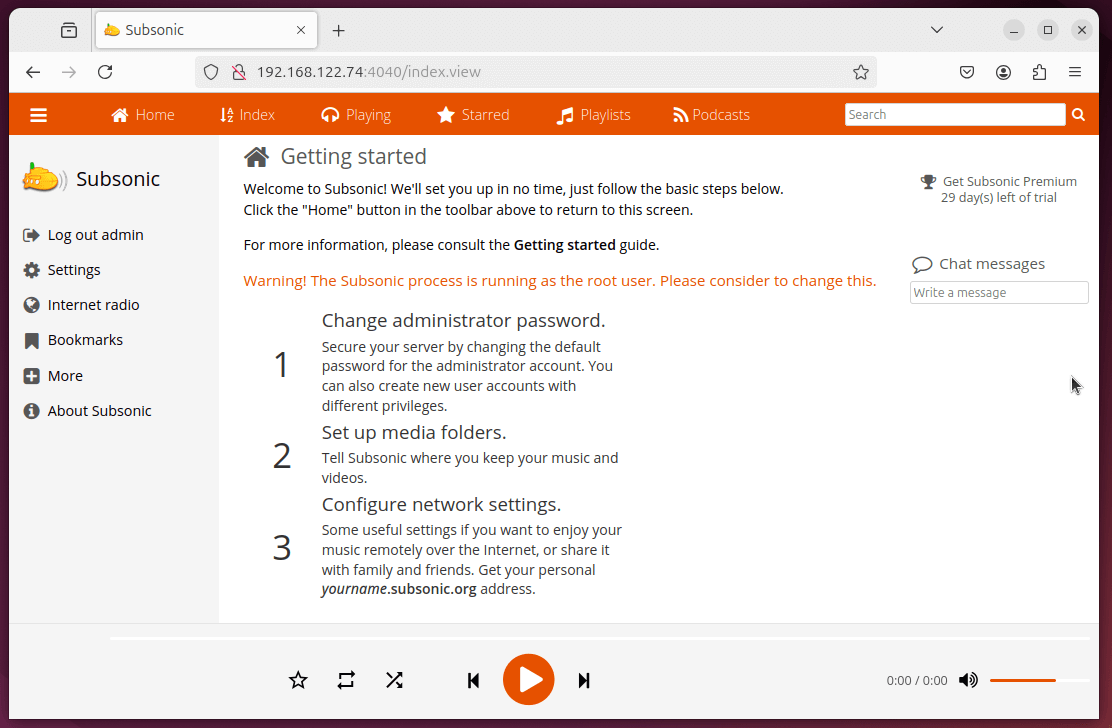 After installation, Subsonic should be running, and you can access it by opening your browser and going to: