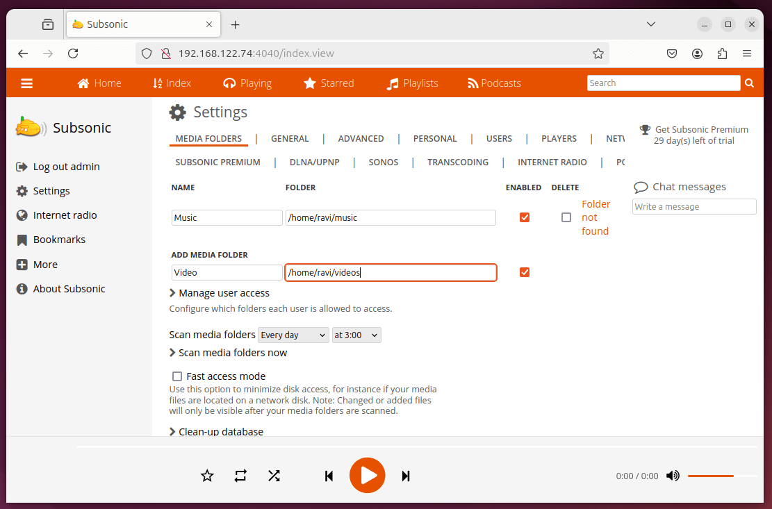 Subsonic needs to know where your music and videos are stored, so follow these steps to add your media folders: