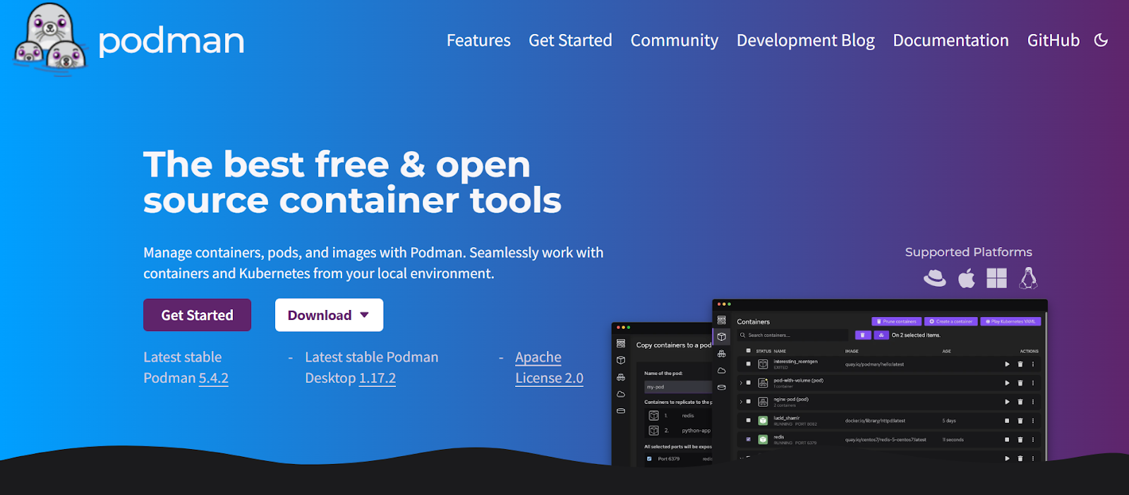 If you prefer using a visual interface instead of typing commands, you can use the Podman Desktop application on Windows, macOS, and Linux. This app gives you a single screen to manage your containers, even if they were created with other tools such as Docker.