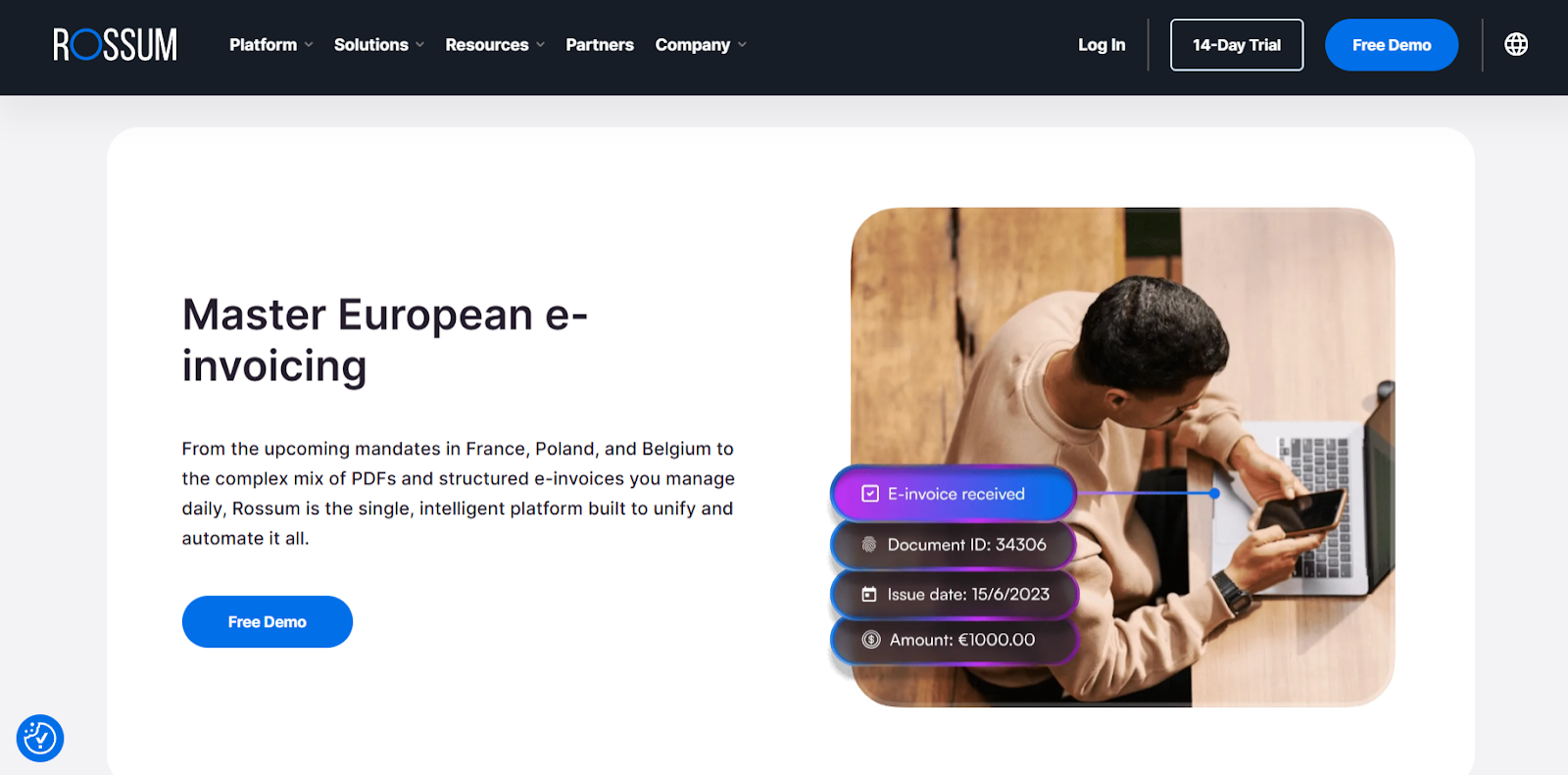 Rossum provides an e-invoicing platform as a single solution designed to handle the complexities of modern businesses, particularly for companies operating across multiple regions. It uses sophisticated AI to automate the entire document lifecycle, from initial receipt to final processing. It also allows businesses to manage a hybrid reality where they receive both traditional PDF invoices and structured e-invoices.