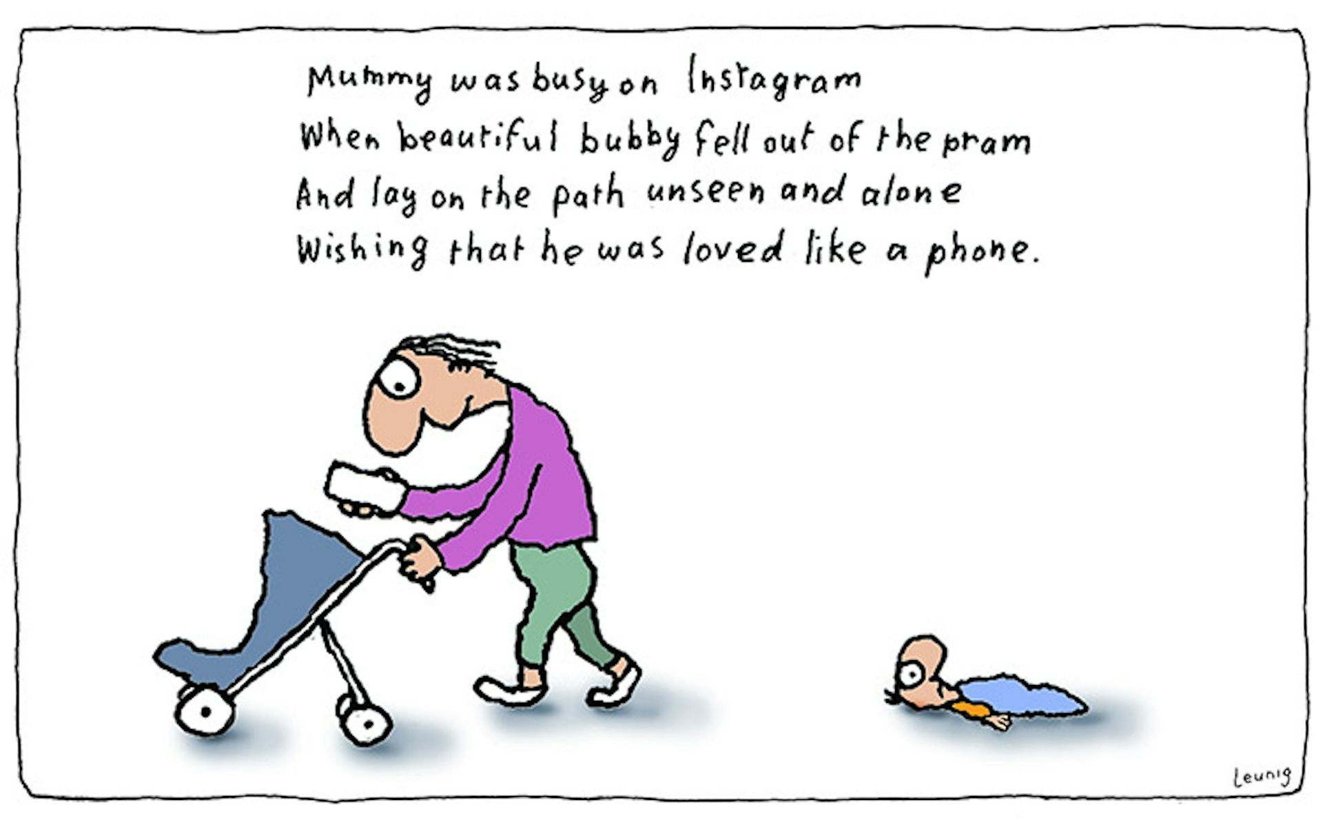 From 2019 – a mother, distracted, looking at her phone rather than her baby. Cries of “misogyny”, including from Leunig’s very talented cartoonist sister, Mary.