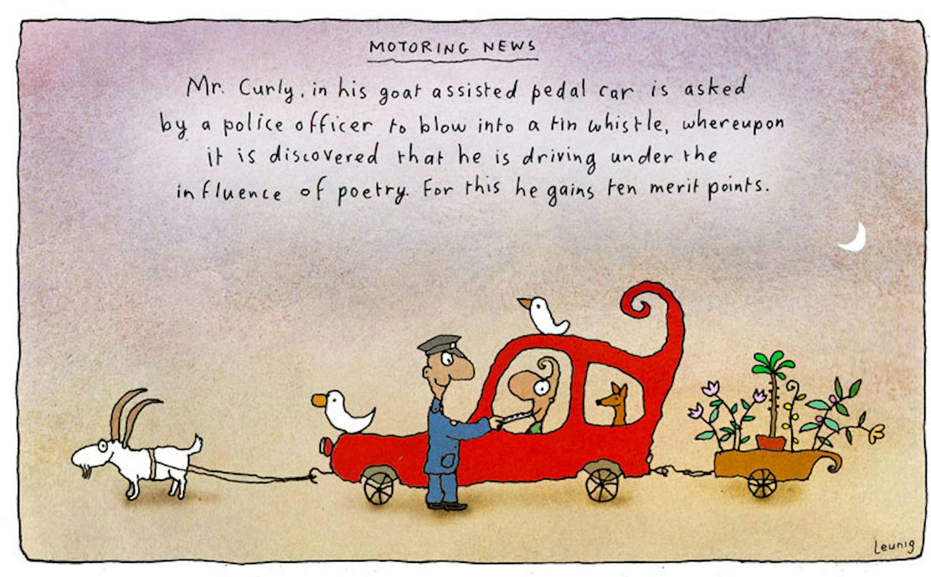 Then he apparently mellowed to become the guru of the Age, still with a capacity to launch the occasional satirical thunderbolt. Decidedly countercultural, together with Patrick Cook and Peter Nicholson, Leunig brought what historian Tony Moore has called “existential and non-materialist themes to the Australian black-and-white tradition”.