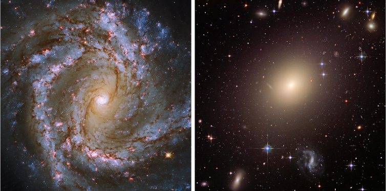 Left: ESA/Hubble & NASA, ESO, J. Lee and the PHANGS-HST Team. Right: NASA, ESA, and The Hubble Heritage Team (STScI/AURA); J. Blakeslee (Washington State University)