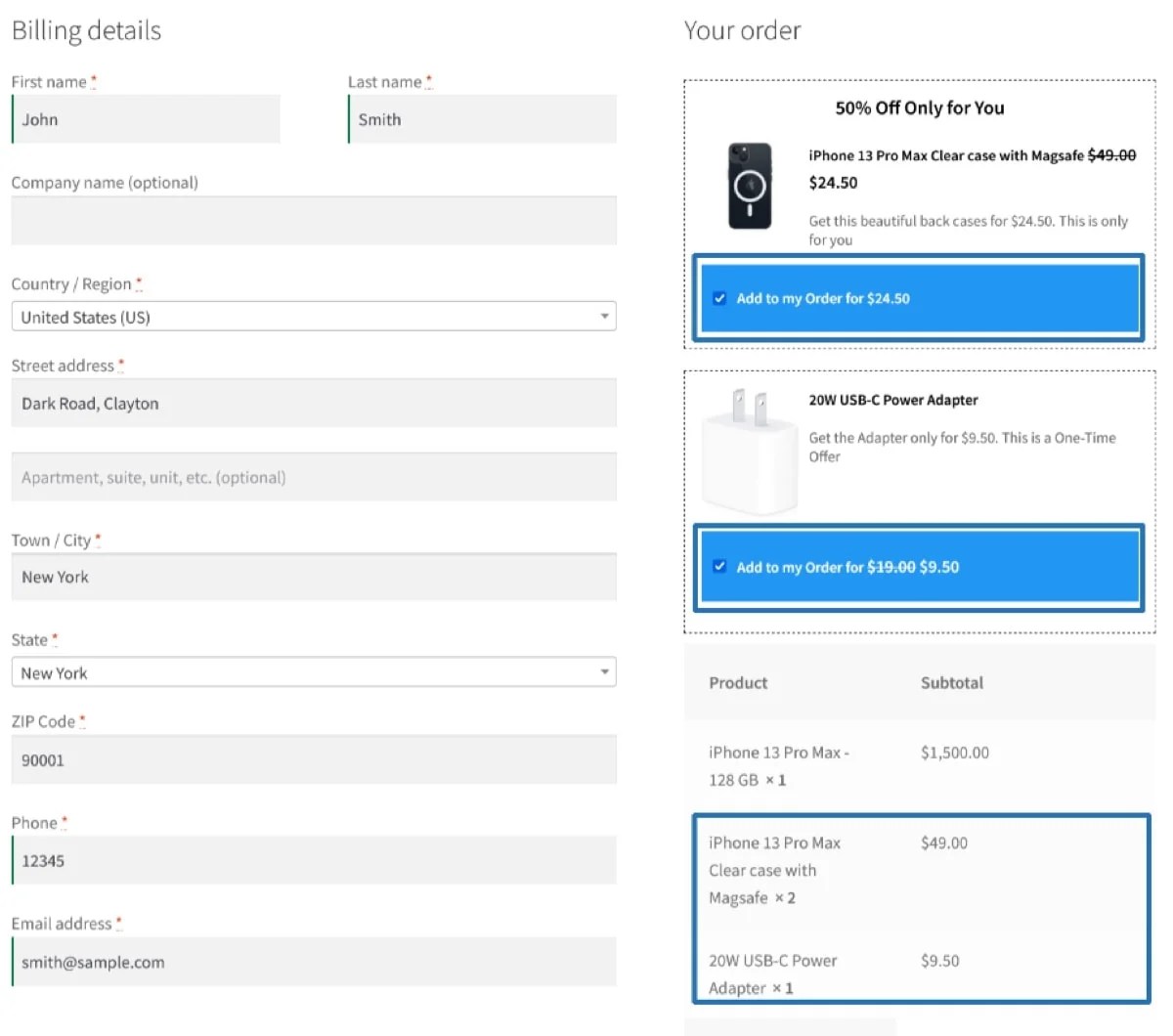 Extensions like OrderBump let you do this automatically based on the type of product, the customer’s purchase history, or the purchase period. In the example below, when a customer buys an iPhone, the extension pulls out relevant upsells like a phone case and a USB C-type power adapter that they might need. Plus, it offers it at a discounted rate, enticing customers to add it to their cart.