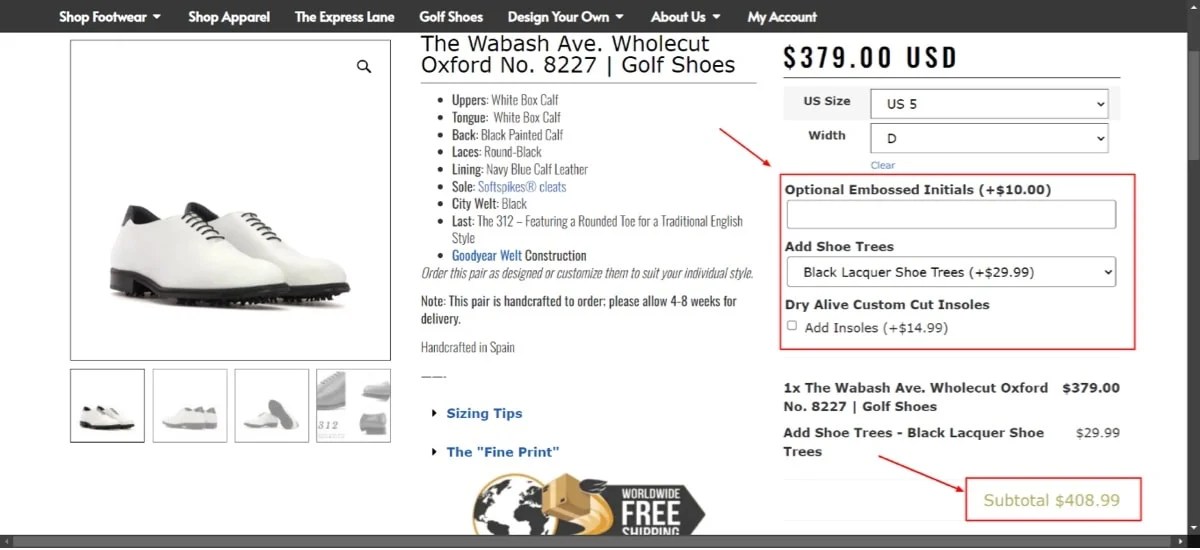 Alternatively, look at your customer’s purchase history and offer personalized recommendations. You can add these categories yourself, offer choices on the product page, or use extensions that rely on algorithms to sort these automatically. That’s what the August Apparel website does, letting shoppers add on optional embossed initials, shoe trees, or insoles.
