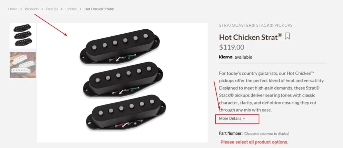Also, include high-quality images and videos so that customers can see the product’s true form before buying it. Here’s an example from Seymour Duncan: